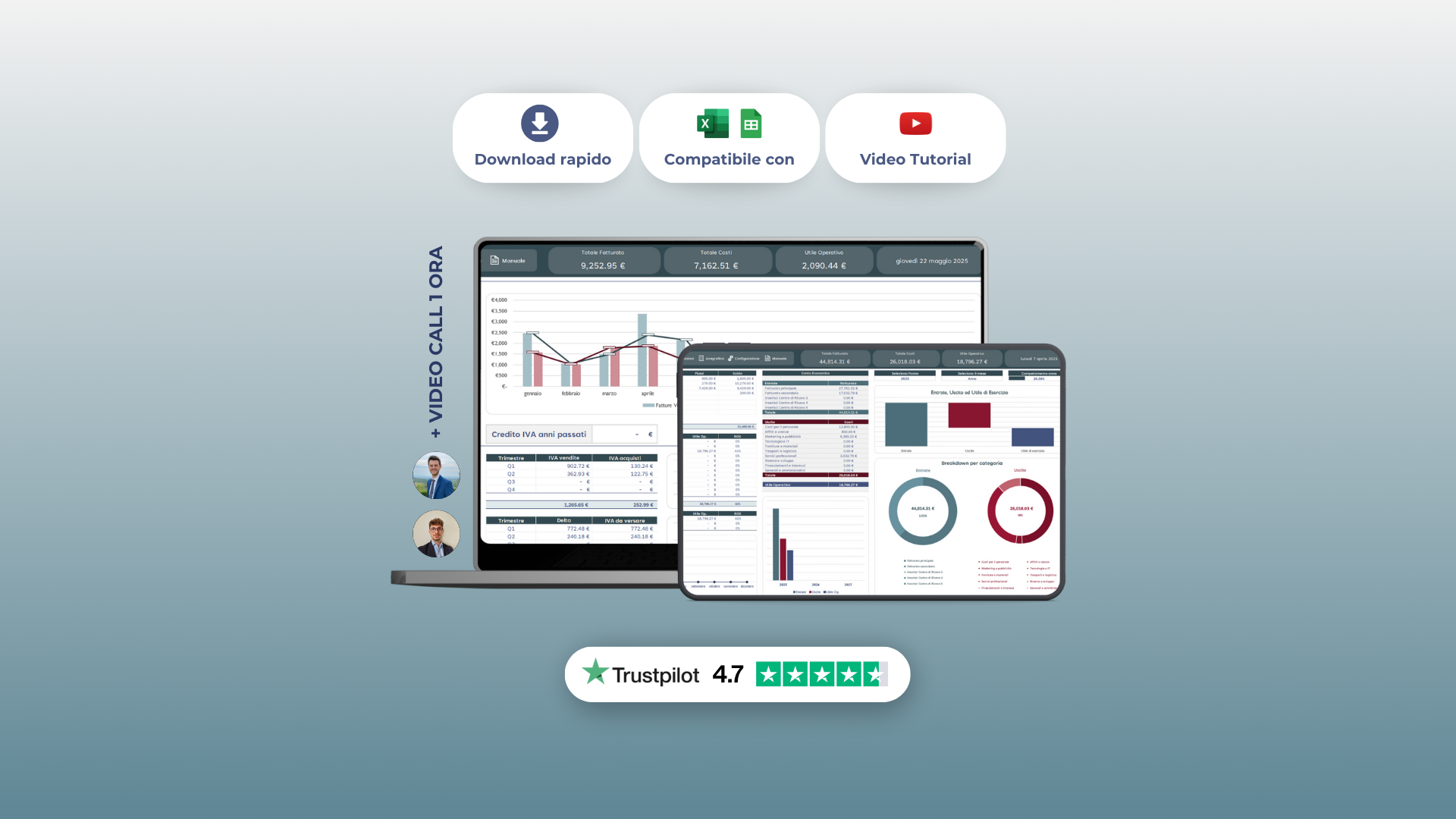 Non ti diamo solo un template: ti offriamo un percorso guidato. Insieme al file hai diritto ad un’ora di video call personalizzata con noi, in cui ti mostreremo passo dopo passo come configurarlo e adattarlo alle tue esigenze. In questo modo eviti errori, risparmi tempo e inizi subito ad utilizzare concretamente il tuo nuovo strumento.
