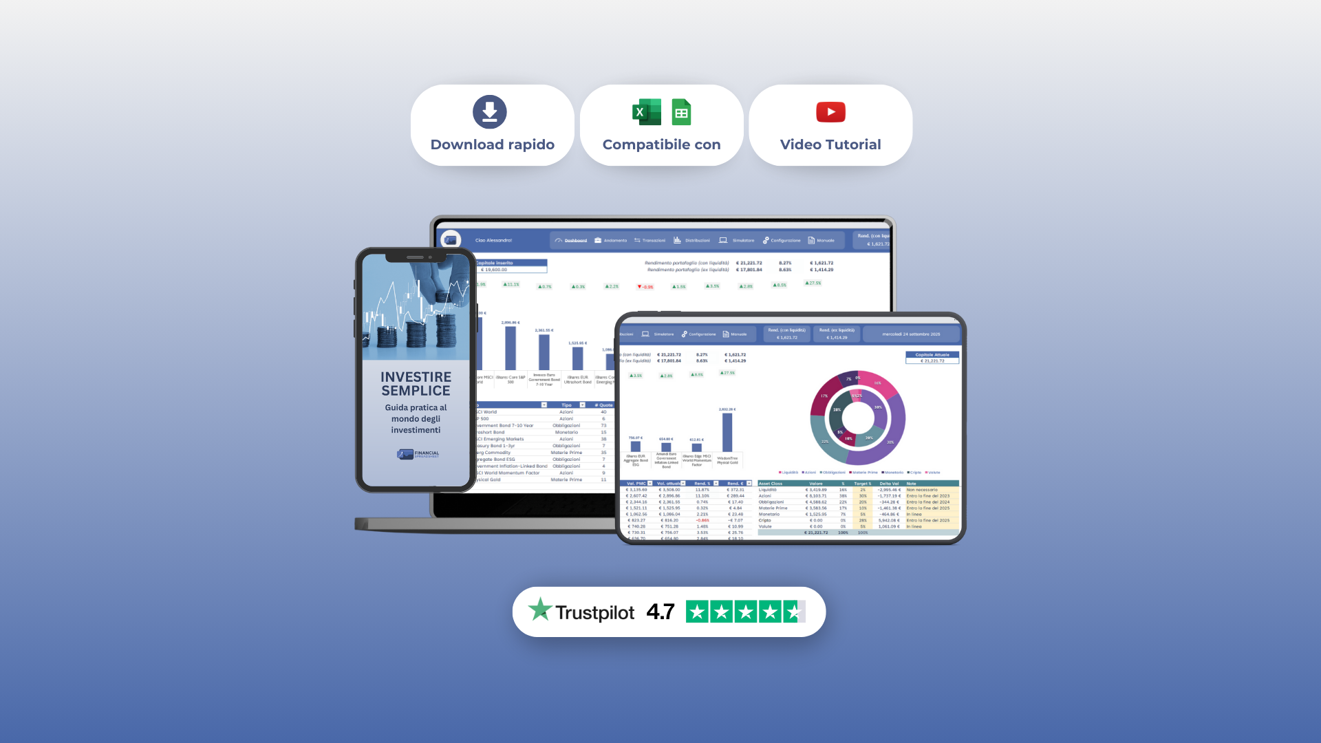 Un unico file per tracciare e analizzare ogni investimento che possiedi, con dati sempre aggiornati e confronti immediati con indici di mercato.