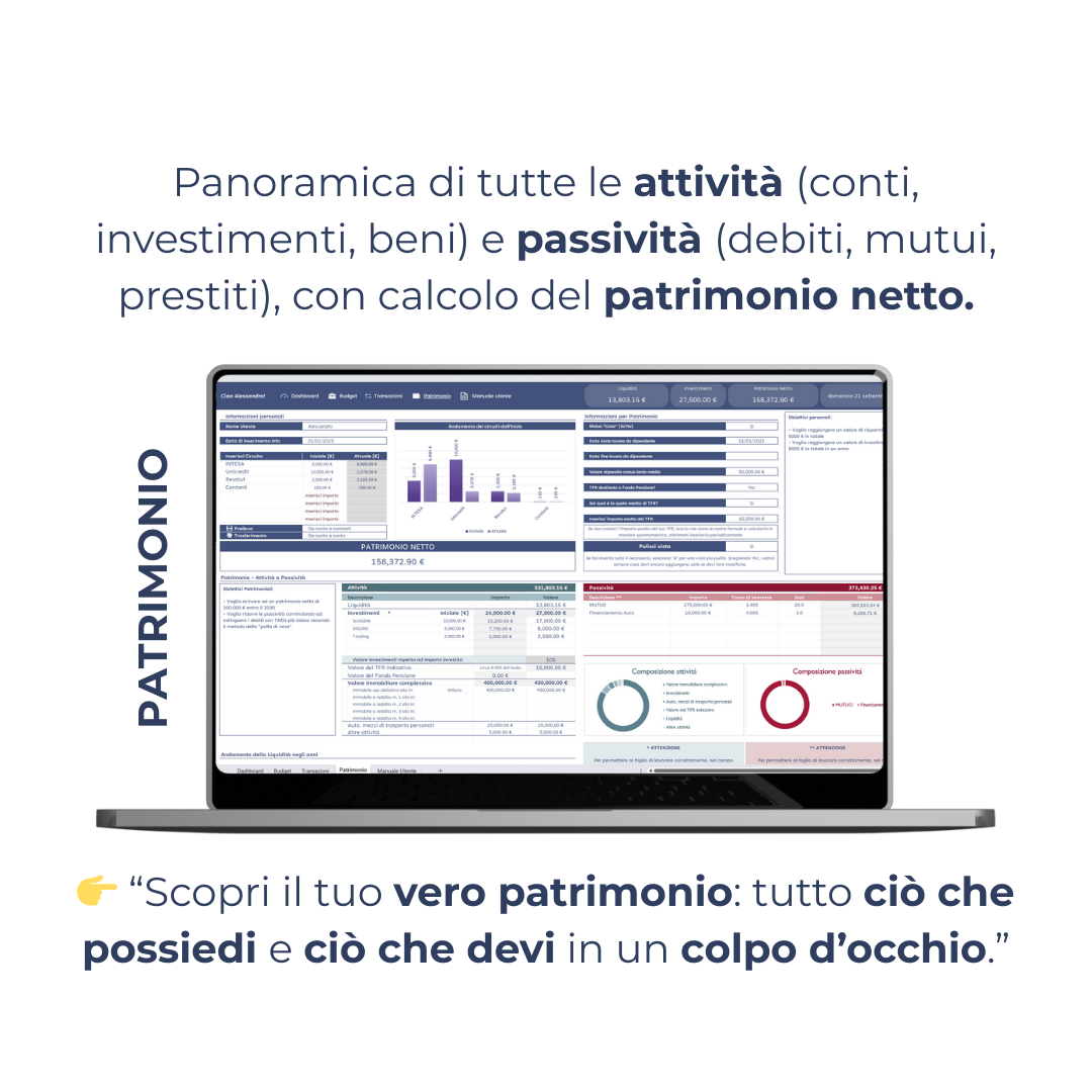 Con il Template Excel “Il Mio Patrimonio” + eBook, tieni sotto controllo tutte le tue finanze e il tuo patrimonio netto in un unico strumento intuitivo, completo e sempre aggiornato.